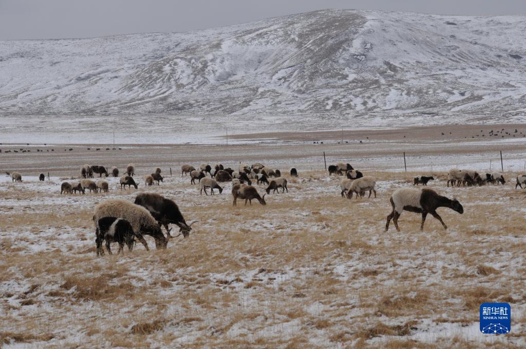 3月31日,青海省黃南藏族自治州河南蒙古族自治縣,一群歐拉羊在雪后的草原上吃草。 新華社記者 王艷 攝