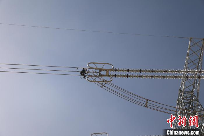 圖為國網(wǎng)青海超高壓公司輸電專業(yè)人員正在開展750千伏青塔I線14號鐵塔消缺工作。 董慶芳 攝