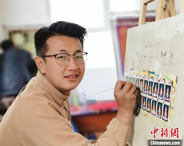 今年23歲的羅藏成立,10歲開始學畫畫,12歲時跟著桑杰加系統學習唐卡,目前,羅藏成立專注于繪制微型唐卡——扎卡,每個月也能掙1萬元左右。