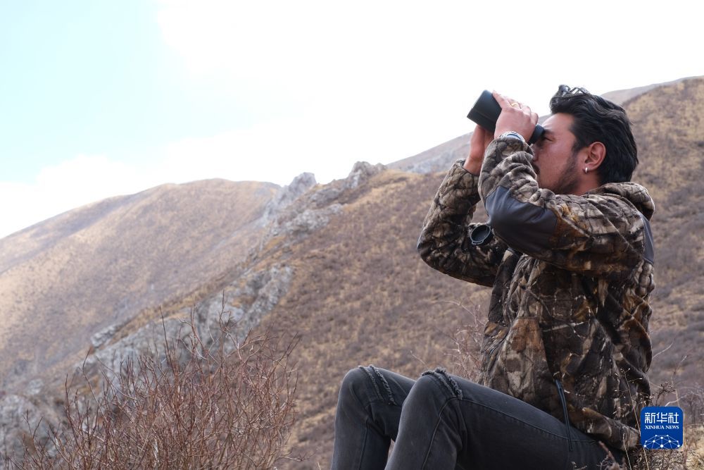 4月22日,生態(tài)管護(hù)員達(dá)杰用望遠(yuǎn)鏡觀察對(duì)面山上的野生動(dòng)物。新華社記者 央秀達(dá)珍 攝