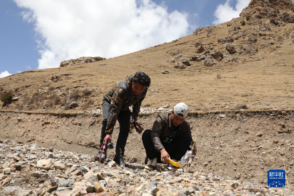 4月22日,生態(tài)管護(hù)員達(dá)杰(左)和尕次在撿垃圾。新華社記者 央秀達(dá)珍 攝