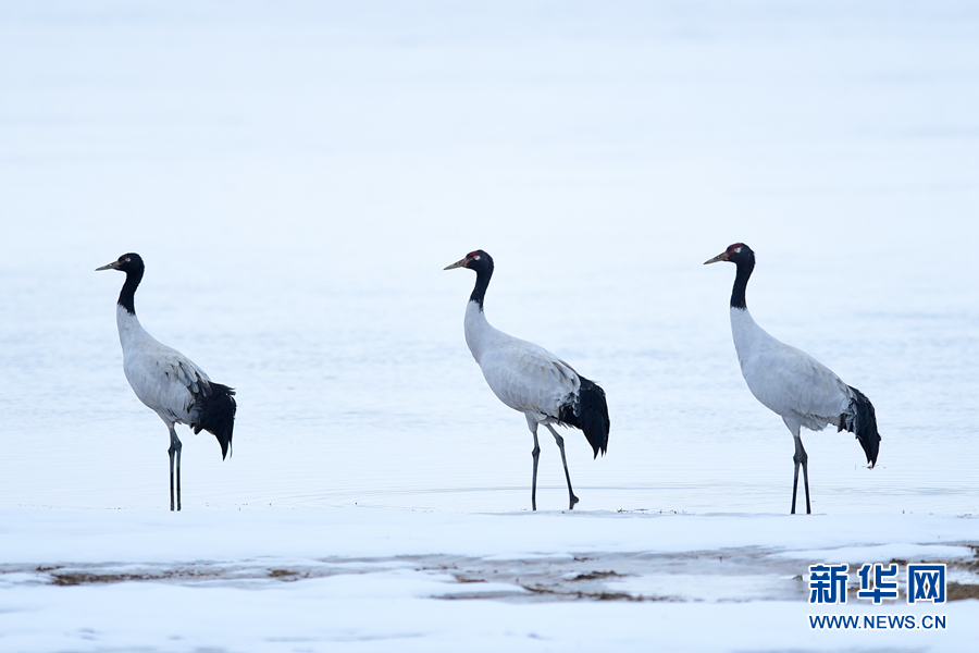 圖為黑頸鶴在青海湖畔散步?!《砣詹囟?攝