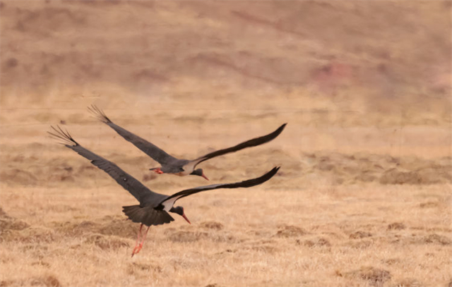 近日,有攝影師在祁連山國家公園亂海子濕地拍攝記錄到4只國家一級重點保護野生動物——黑鸛,它們時而低頭覓食、時而展翅飛翔。黑鸛是一種體態優美、體色鮮明、性情機警的大型涉禽,屬世界瀕危鳥類之一,在中國僅有1000多只,珍稀程度不亞于大熊貓,因此也有“鳥中大熊貓”之稱。
