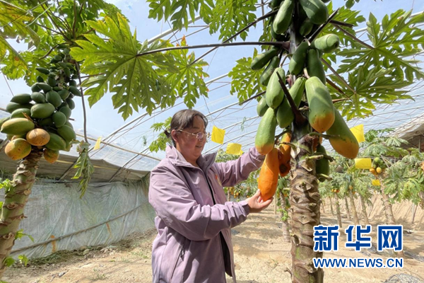 (資料圖)農(nóng)戶(hù)查看特色種植水果的長(zhǎng)勢(shì)。新華網(wǎng)發(fā)