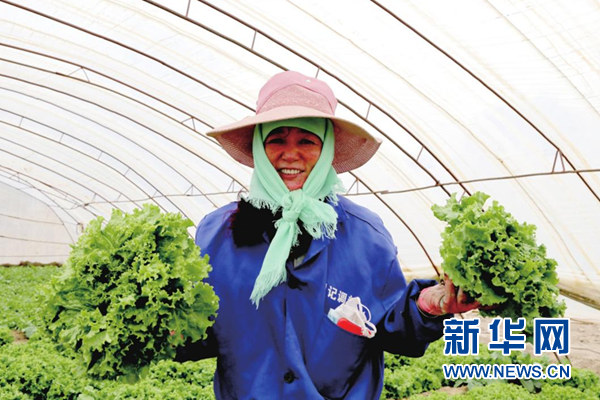 (資料圖)農(nóng)戶(hù)展示在大棚內(nèi)收獲的蔬菜。新華網(wǎng)發(fā)
