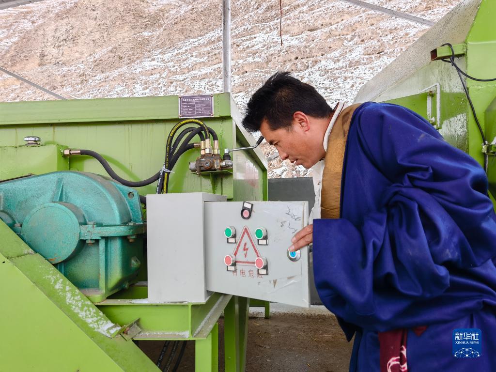 4月27日,在青海省玉樹藏族自治州稱多縣三江源高原現代生態牧業示范點,工作人員在清理草料拌料機。新華社記者 柳澤興 攝