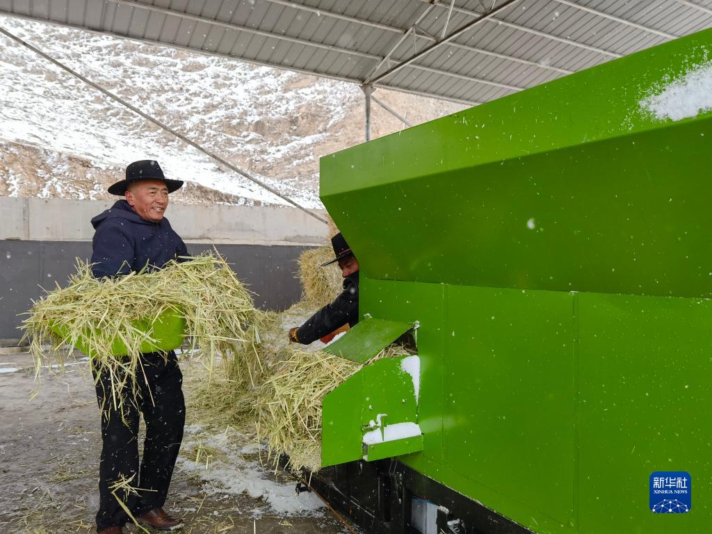 4月27日,在青海省玉樹藏族自治州稱多縣三江源高原現代生態牧業示范點,昂巴拉農牧民專業合作社理事長布德在處理草料。新華社記者 柳澤興 攝