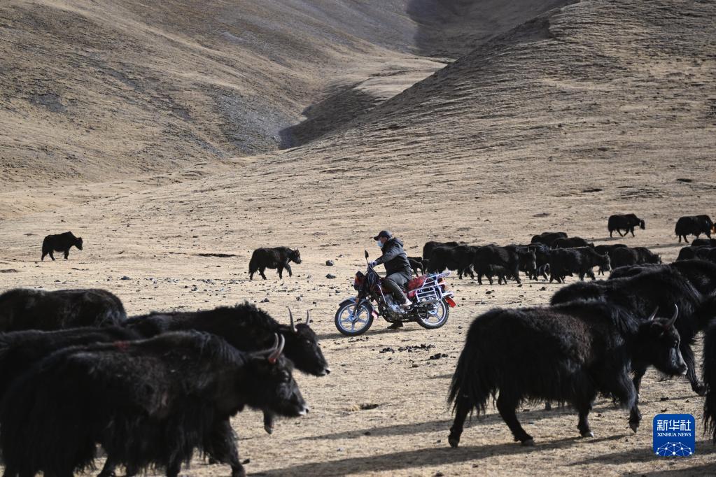 4月20日,在青海省玉樹藏族自治州曲麻萊縣葉格鄉紅旗村,牧民騎著摩托照料野血牦牛。新華社記者 張龍 攝