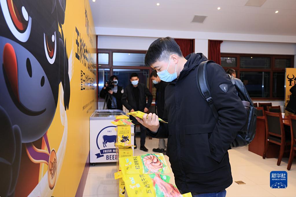 2月23日,“玉樹牦牛進北京”懇談會暨玉樹牦牛美食品鑒會在北京舉行,消費者在挑選月盛齋制作的玉樹牦牛肉醬鹵產品。新華社發