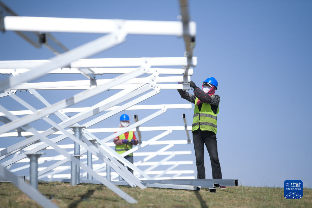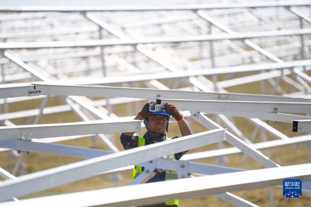 6月8日,工人在黃河上游水電開發(fā)有限責(zé)任公司海南基地共和縣100萬千瓦光伏項(xiàng)目現(xiàn)場(chǎng)施工。新華社記者 駱曉飛 攝