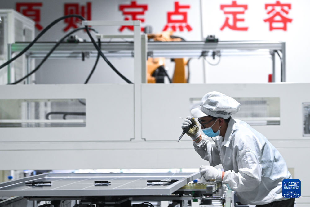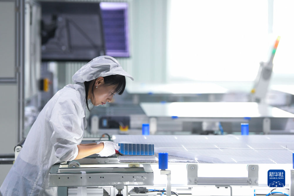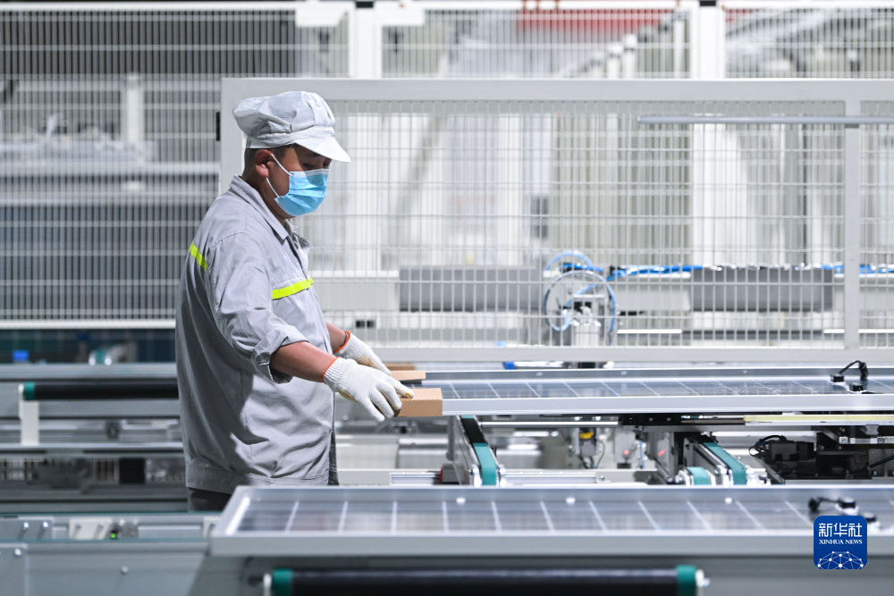 6月7日,青海隆基樂葉光伏科技有限公司工人在廠區(qū)加工光伏組件。新華社記者 駱曉飛 攝