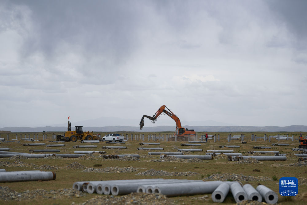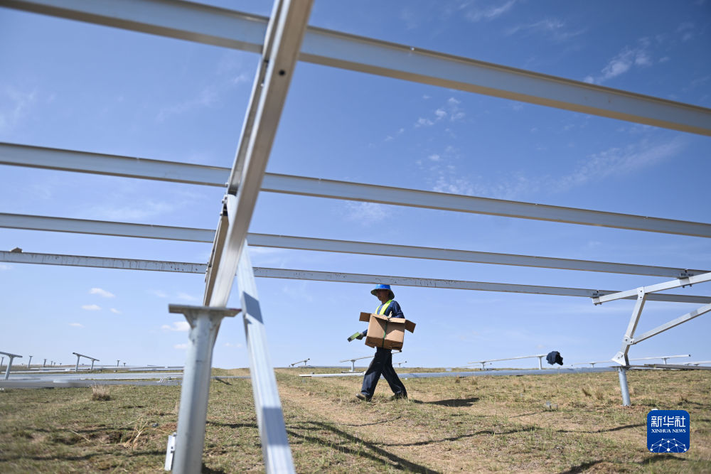6月8日,工人在國(guó)家能源集團(tuán)海南基地共和縣100萬千瓦牧光儲(chǔ)二期20萬千瓦建設(shè)項(xiàng)目施工。新華社記者 張龍 攝