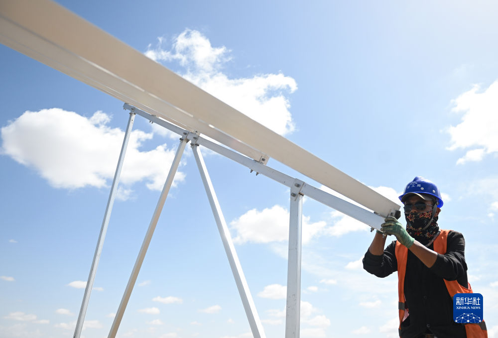 6月8日,工人在黃河上游水電開發(fā)有限責(zé)任公司海南基地共和縣100萬千瓦光伏項(xiàng)目施工。新華社記者 張龍 攝
