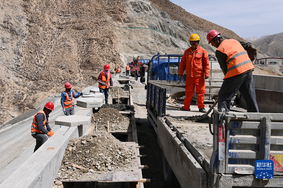 6月8日,在蓄集峽水利樞紐工程現場,施工人員進行大壩后預制塊鋪裝作業。新華社記者 范培珅 攝