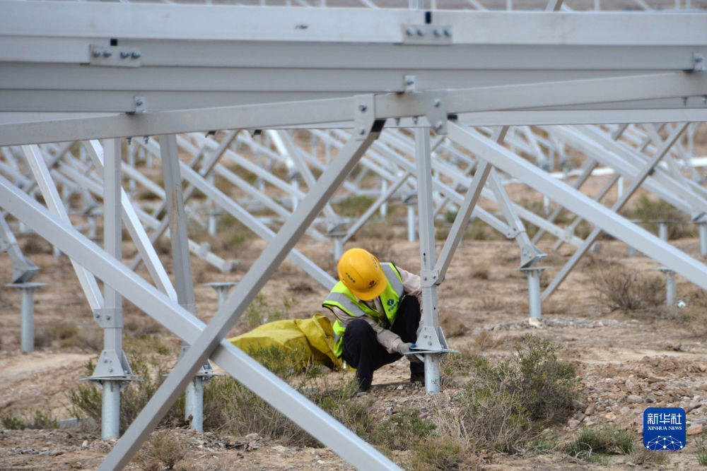 6月7日,在國家電投集團黃河公司德令哈220萬千瓦多能互補項目一期100萬千瓦光伏項目建設現場,工人安裝光伏支架。新華社記者 范培珅 攝