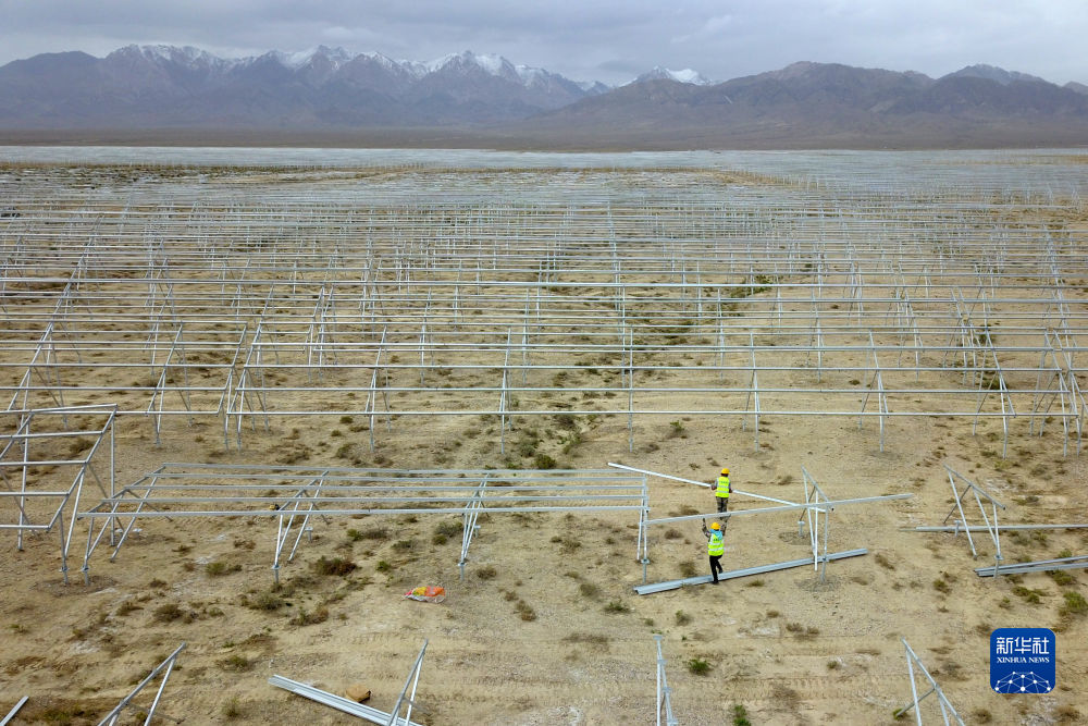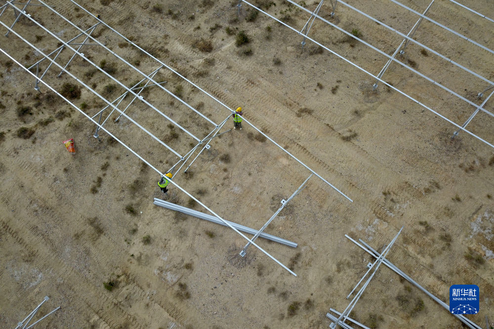 6月7日,在國家電投集團黃河公司德令哈220萬千瓦多能互補項目一期100萬千瓦光伏項目建設現場,工人安裝光伏支架(無人機照片)。新華社記者 范培珅 攝