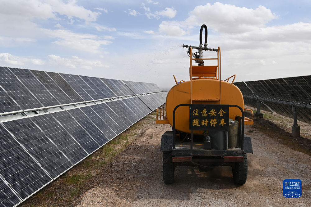 6月7日,在海西蒙古族藏族自治州德令哈市光伏(光熱)產業園的一家光伏電站,工作人員準備駕駛車輛清潔光伏板。新華社記者 范培珅 攝