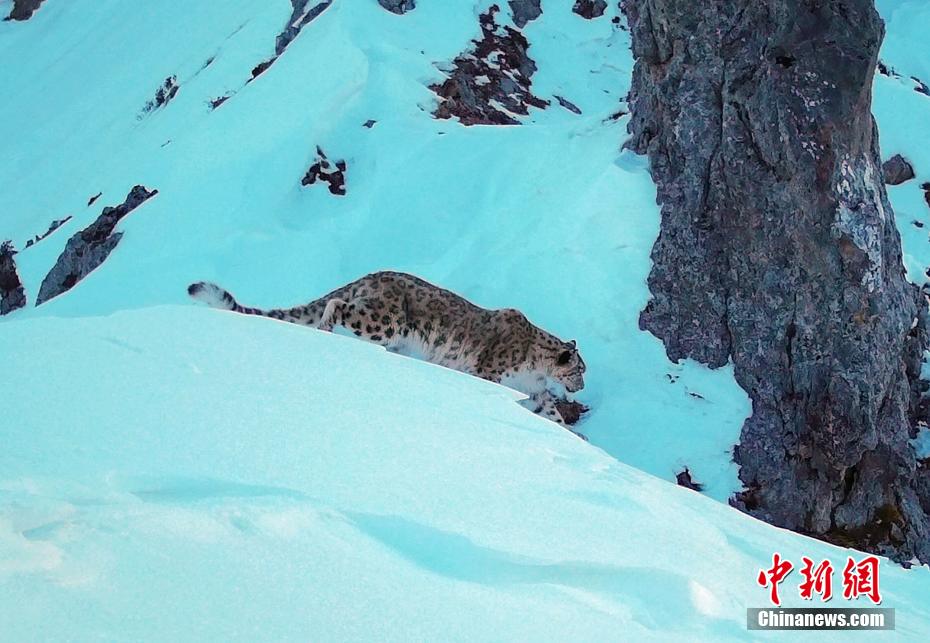近日,大熊貓國家公園王朗片區在回收高山紅外相機時,發現再次拍到國家一級保護動物雪豹的活動影像。紅外相機視頻時間顯示,此次獲得的雪豹影像拍攝于2021年11月,工作人員通過斑點比對,確定該雪豹為去年首次拍攝到的兩只雪豹中的一只。圖為紅外相機拍攝到的雪豹影像。 大熊貓國家公園王朗片區 供圖