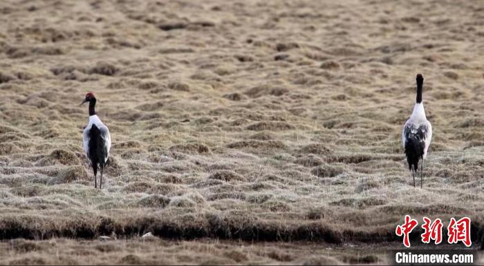 圖為兩只黑頸鶴在濕地中漫步。天峻縣融媒體中心 供圖