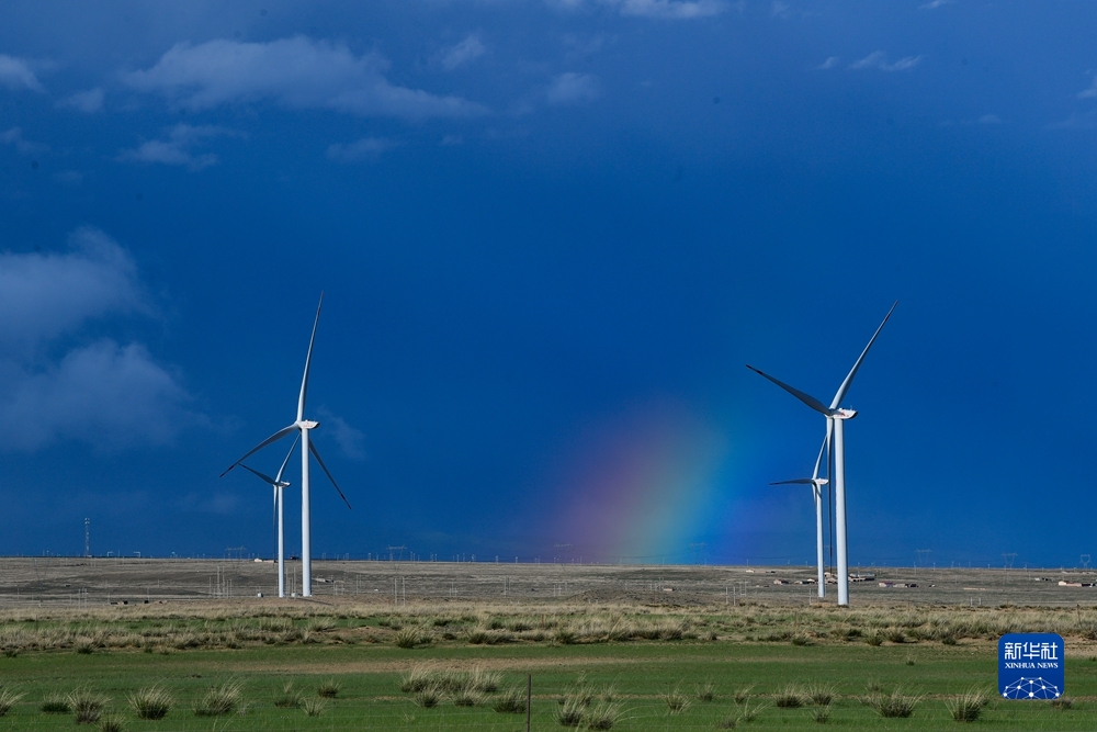這是6月26日在青海省海南藏族自治州共和縣拍攝的風力發電機。新華社記者 張龍 攝