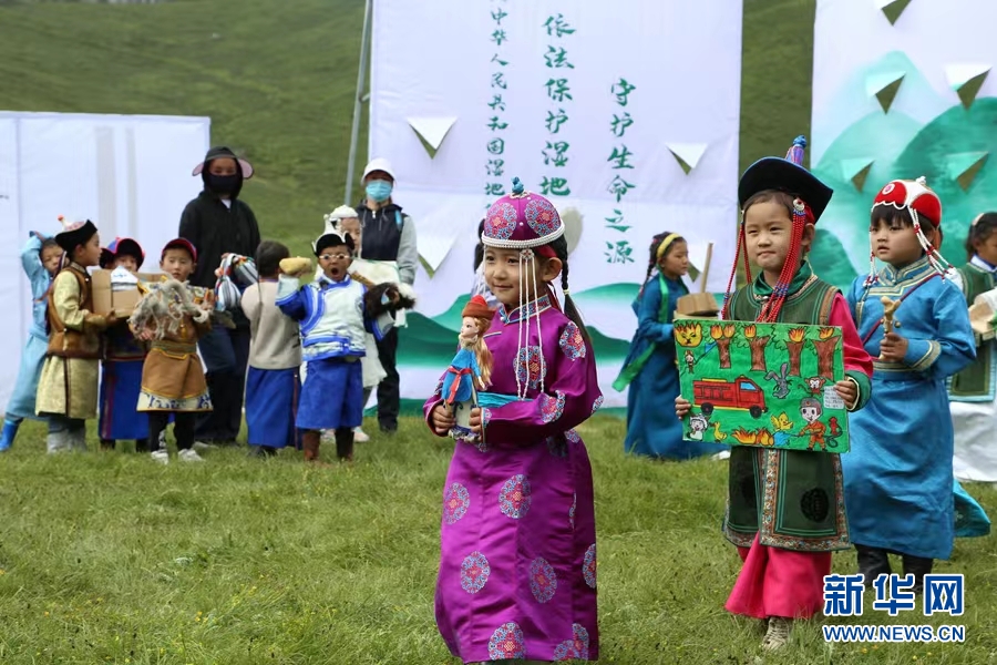 自2019年起,青海洮河源國(guó)家濕地公園每年夏季都會(huì)組織周邊幼兒園及中小學(xué)生開展科普教育活動(dòng),向?qū)W生們講授濕地基礎(chǔ)知識(shí)、了解植物和野生動(dòng)物知識(shí)等,在體驗(yàn)自然奧秘和美麗的同時(shí),培養(yǎng)學(xué)生愛護(hù)環(huán)境、保護(hù)生態(tài)的意識(shí)。正值盛夏,這里天空湛藍(lán)、水草豐美。科普宣教員多杰康卓在給來(lái)自河南縣賽龍鄉(xiāng)中心寄宿制完全小學(xué)五年級(jí)的學(xué)生們上生態(tài)課。 “濕地被譽(yù)為‘地球之腎’,是生物多樣性富集的生態(tài)系統(tǒng)和人類重要的生存環(huán)境之一,具有涵養(yǎng)水源、凈化水質(zhì)、維護(hù)生物多樣性等重要的生態(tài)功能。”多杰康卓給大家講授濕地環(huán)保知識(shí),也與學(xué)生們一同分享大家創(chuàng)作的環(huán)保主題作品。