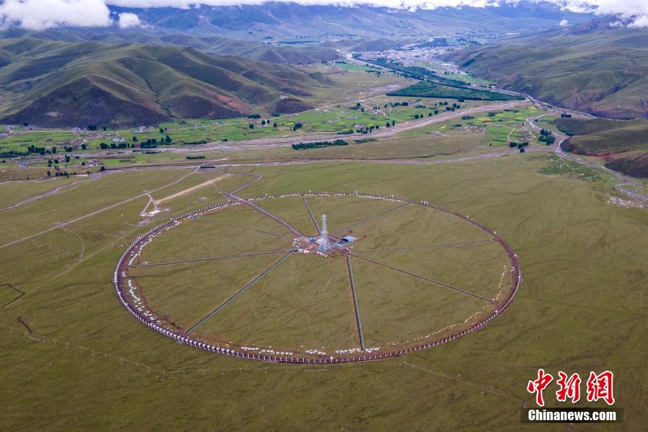 6月29日,四川稻城,航拍空間環境地基綜合監測網(子午工程二期)全景,中間為定標塔。四川省甘孜州稻城縣境內,國家重大科技基礎設施空間環境地基綜合監測網(子午工程二期),正在進行緊張的設備安裝,預計2022年底完成天線安裝調試工作。 中新社記者 劉忠俊 攝