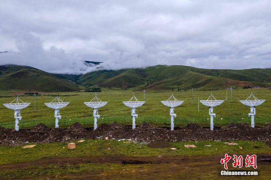 6月29日,四川稻城,空間環境地基綜合監測網(子午工程二期)安裝完成的天線。四川省甘孜州稻城縣境內,國家重大科技基礎設施空間環境地基綜合監測網(子午工程二期),正在進行緊張的設備安裝,預計2022年底完成天線安裝調試工作。(無人機照片) 中新社記者 劉忠俊 攝