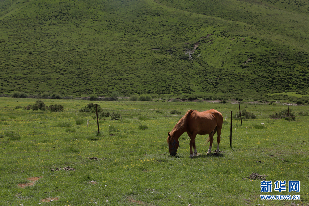 青海洮河源國(guó)家濕地公園內(nèi),一匹馬兒正在愜意地吃草。新華網(wǎng) 卡婭梅朵 攝