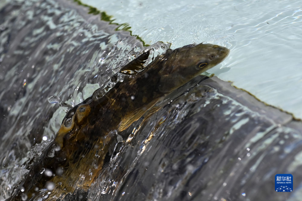 6月30日,在位于青海省海北藏族自治州剛察縣的泉吉河中,一條湟魚躍起向上洄游。新華社記者 范培珅 攝