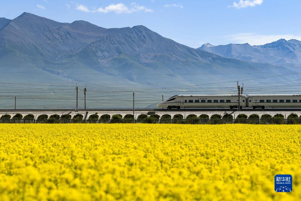 7月3日,列車駛過青海省海北藏族自治州門源回族自治縣境內的油菜花田。新華社記者 張龍 攝