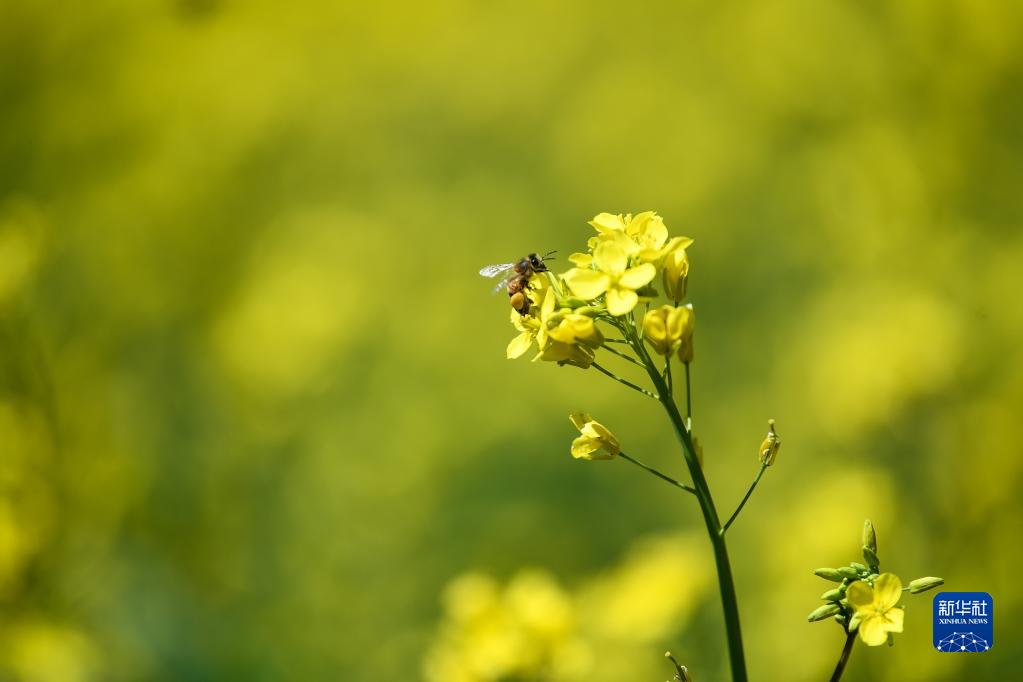 7月2日,在青海省海北藏族自治州門源回族自治縣境內的油菜花田里,一只蜜蜂在采蜜。新華社記者 張龍 攝