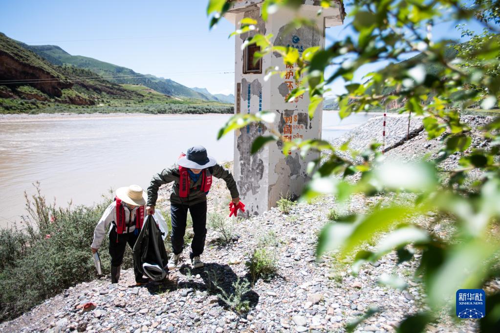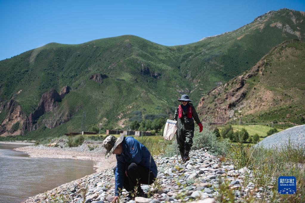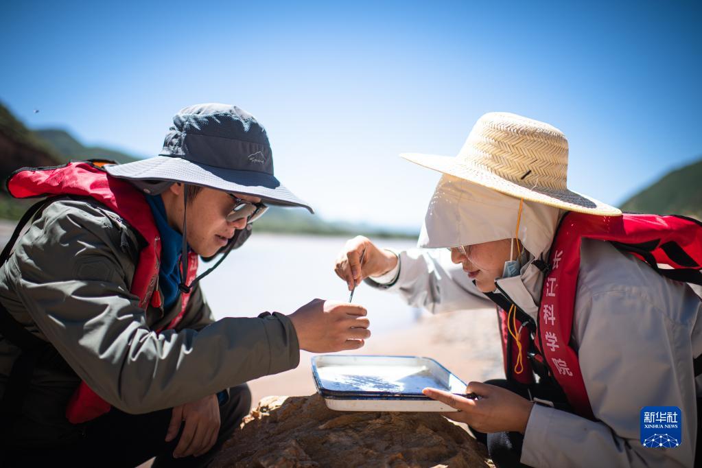 7月24日,長江科學院科考隊員劉晗(右)在瀾滄江源區的扎曲采集魚類樣本。新華社記者 肖藝九 攝