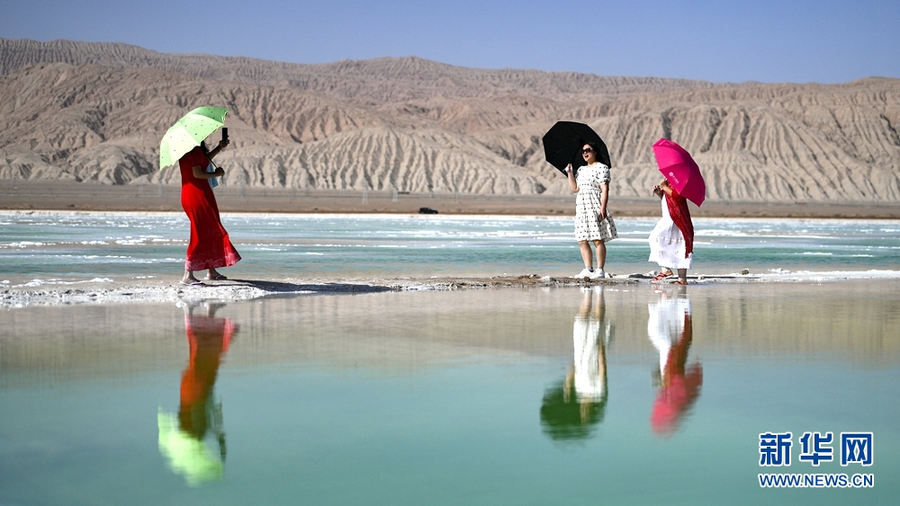 7月22日,游客在海西州茫崖市境內的翡翠湖游玩。