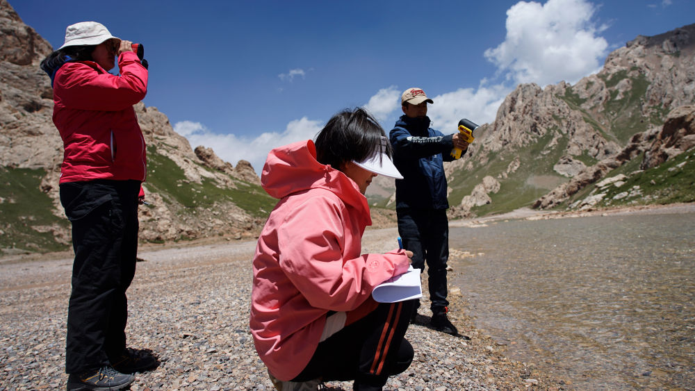 7月27日,來自青海省水文水資源測報中心的江源科考隊員在測量河流流速和記錄數據。新華社 陳杰 攝