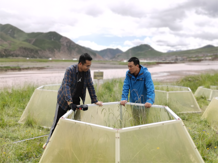 “模擬增溫試驗”是國際上觀測不同增溫狀態下植物生態系統變化的主要研究方式。這項實驗通過在草地上安裝不同高度的溫箱,布設傳感器觀測箱內溫度,模擬形成不同增溫條件,從而分析以高原嵩草為優勢種的高寒草甸植被對氣候變暖的響應。