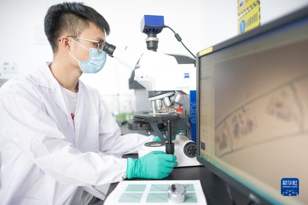8月3日,在長江科學院實驗室,科研人員對長江源區采集的藻類樣本進行鑒定。 新華社記者 肖藝九 攝