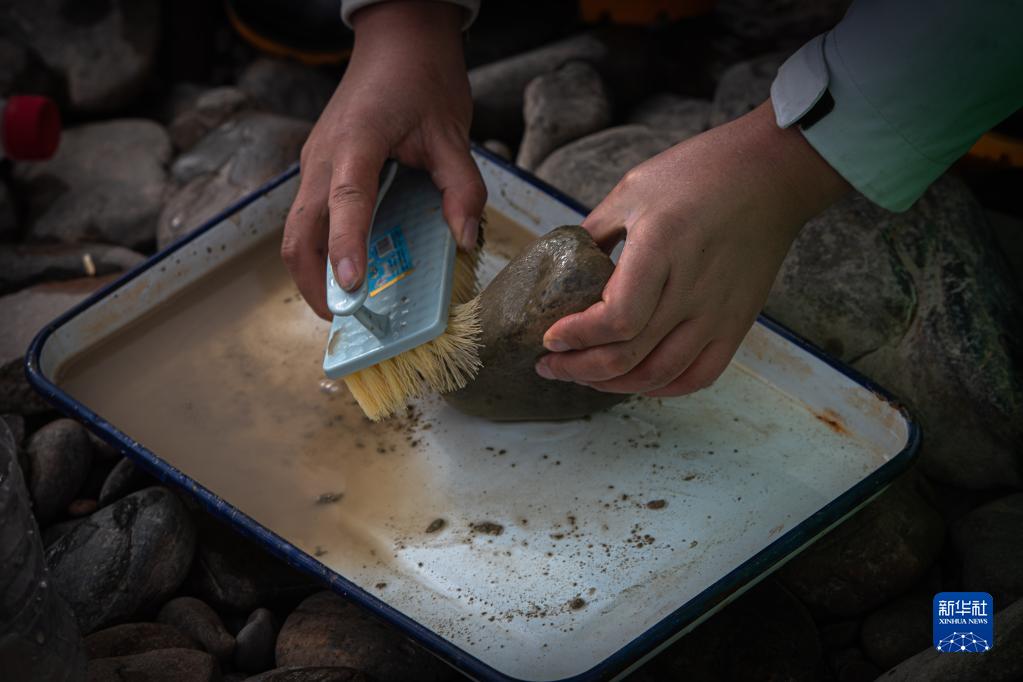 7月24日,長江科學院科考隊員李魯丹在采集底棲動物樣本。 新華社記者 肖藝九 攝