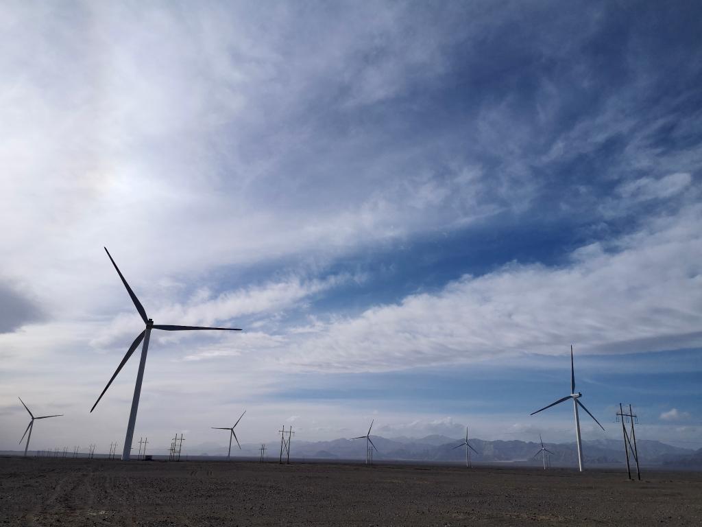 這是2022年7月4日拍攝的中廣核青海冷湖風力發電有限公司茫崖5號平攤100兆瓦風電項目一角。(新華社發)