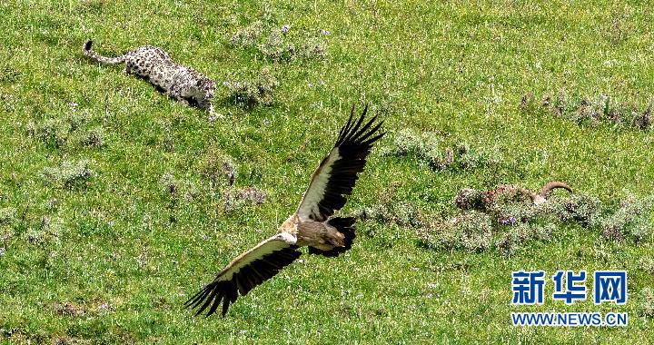 自然觀察愛好者在2022年昂賽自然觀察節上拍攝到的雪豹和高山兀鷲。新華網發 (李梓豪 攝)