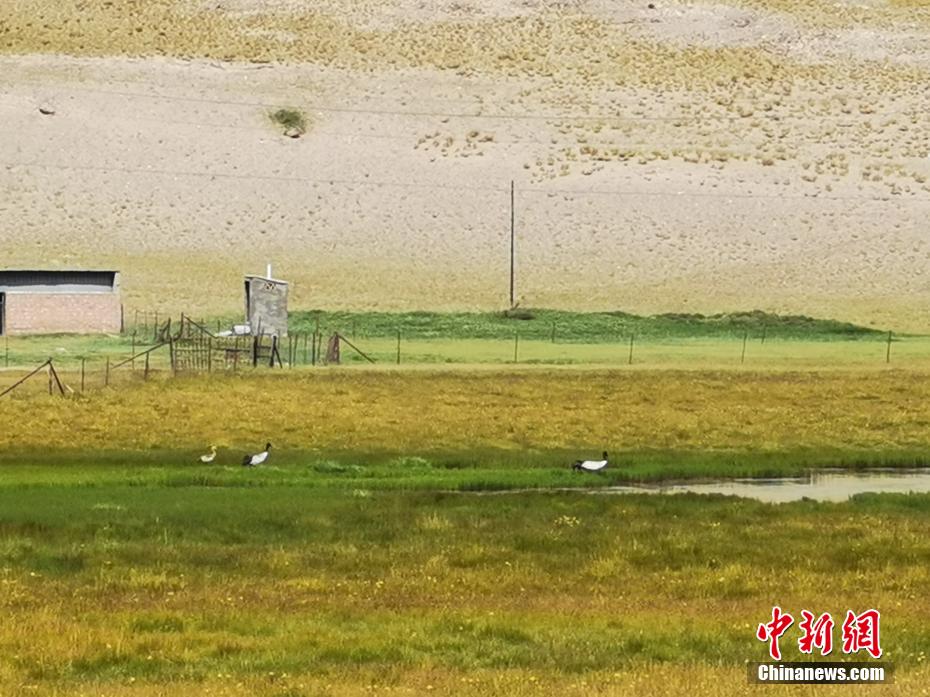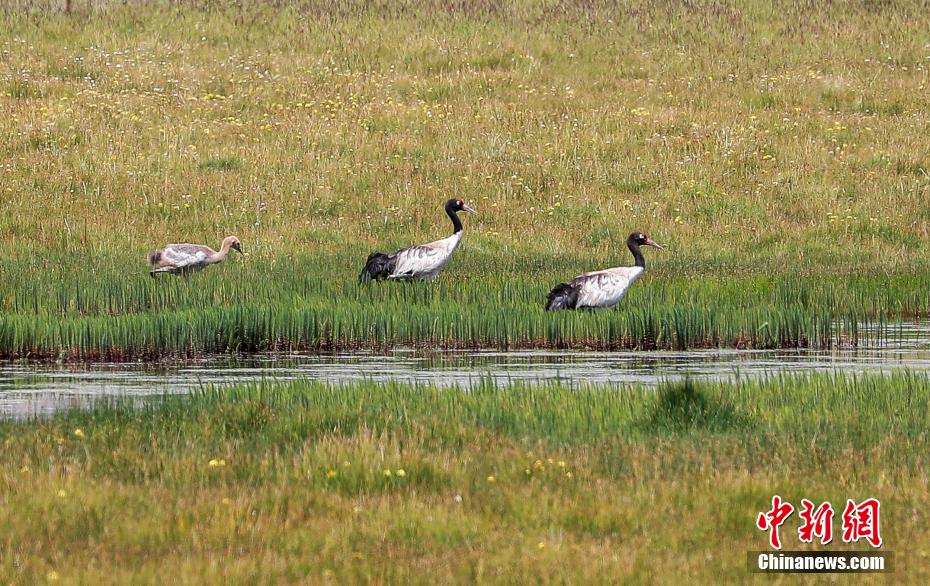 8月9日,祁連山南麓的青海省海北藏族自治州祁連縣央隆鄉,三只黑頸鶴正在央隆濕地悠閑踱步,不時發出鳴叫聲。黑頸鶴是大型飛行涉禽,頸的上部為黑色,故稱黑頸鶴。每年,黑頸鶴在春季遷徙到繁殖地,秋季到達越冬地,是世界上唯一生長、繁殖在高原的鶴。