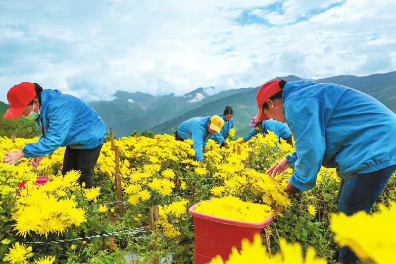 進入8月,在四川省涼山州木里藏族自治縣喬瓦鎮簸箕籮村木里縣農業產業示范園里,150畝的金絲皇菊像一塊巨大的金色地毯鋪在田野上。“現在正是金絲皇菊的采收時節,村民們的腰包又要鼓起來了!”木里縣委書記高峰說。