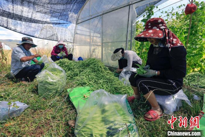 八月中旬,在四川省阿壩藏族羌族自治州壤塘縣的熱布卡蔬菜基地,五月種植的第一批四季豆(學名菜豆,下同)正值豐收。50歲的陳老會年初從云南來到四川壤塘工作,她和工友們將剛采摘的四季豆篩選裝袋,近五十斤重的包裝袋整齊鋪滿地面。“我們下午采摘的蔬菜,第二天早上就能出現在成都的市場上。”她頭也不抬地忙著手中的活。