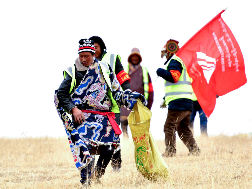 在三江源國家公園黃河源園區,扎陵湖鄉生態保護站勒那村生態管護隊第七組的隊員在撿拾垃圾(2018年12月2日攝)。新華社記者 張龍 攝