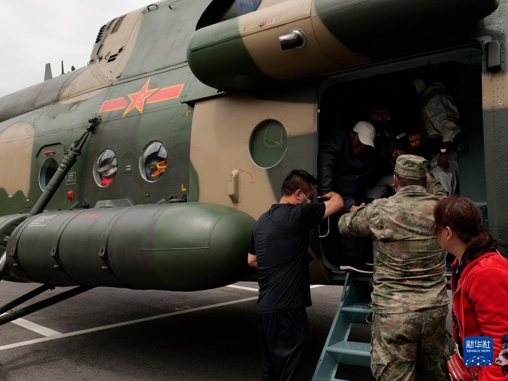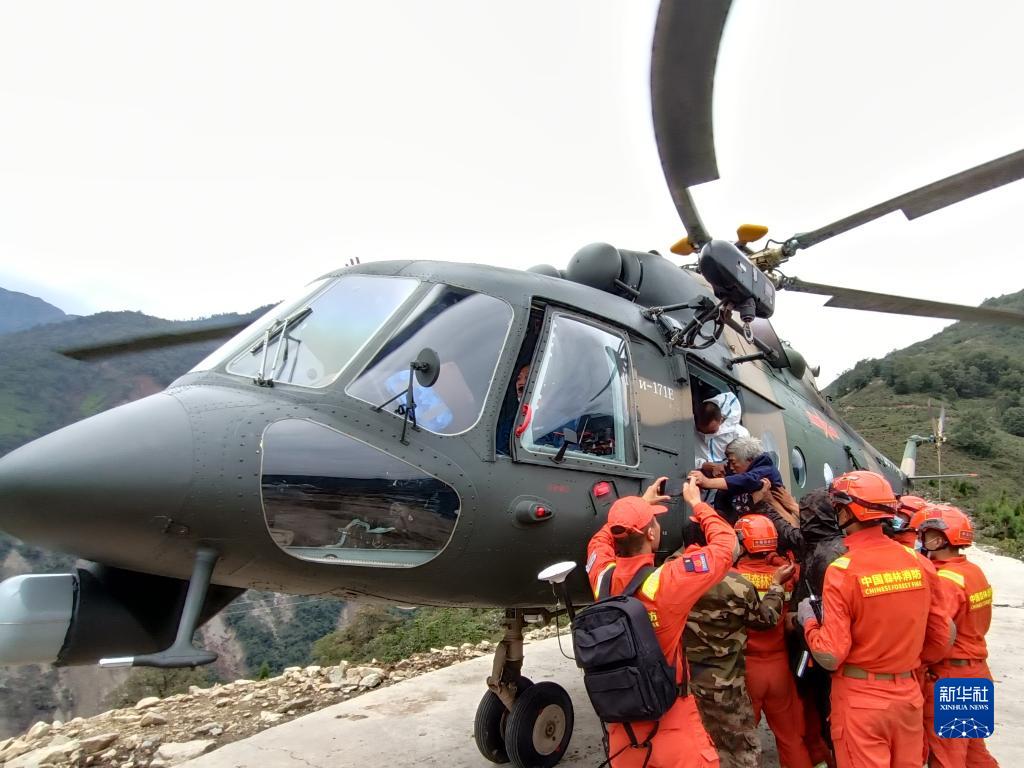 9月6日,西部戰區空軍某部緊急出動直升機在瀘定縣轉移群眾。新華社發(胡建軍 攝)