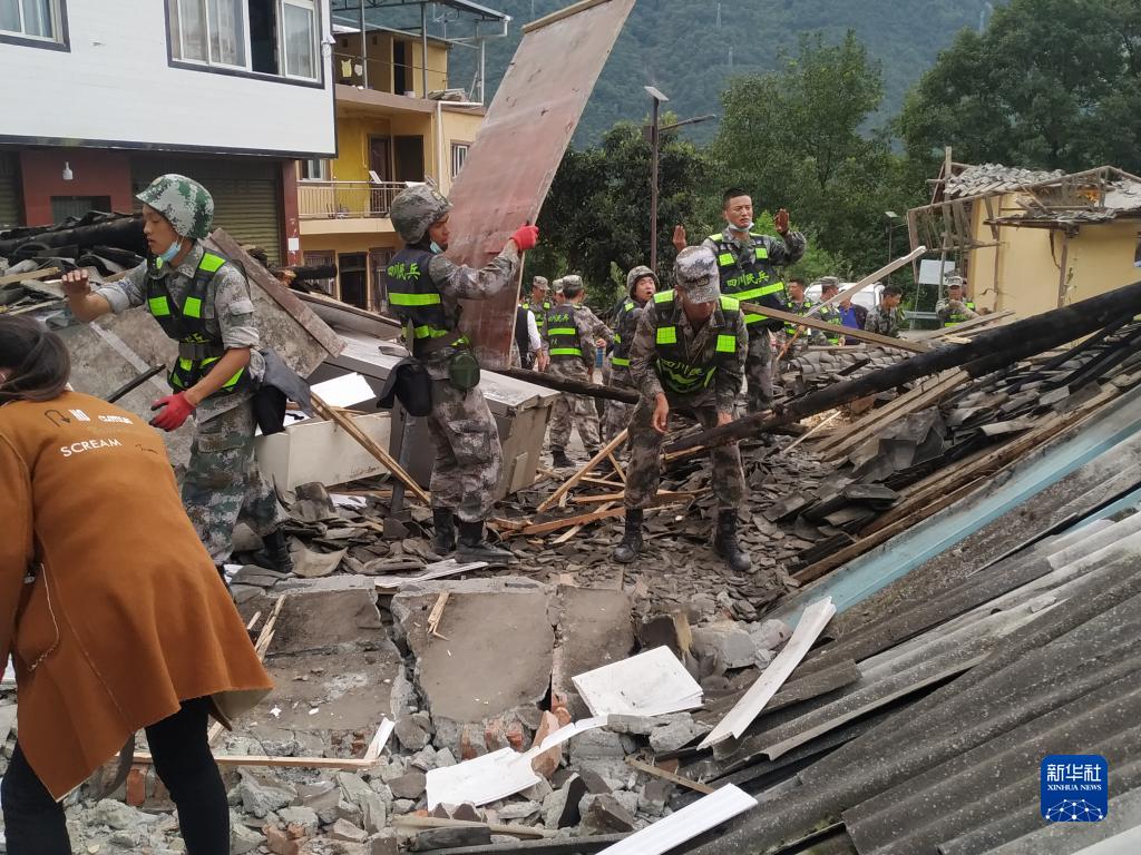 9月6日,四川瀘定縣人武部組織民兵在磨西鎮磨子溝村進行清理作業。新華社發(冉培宗 攝)