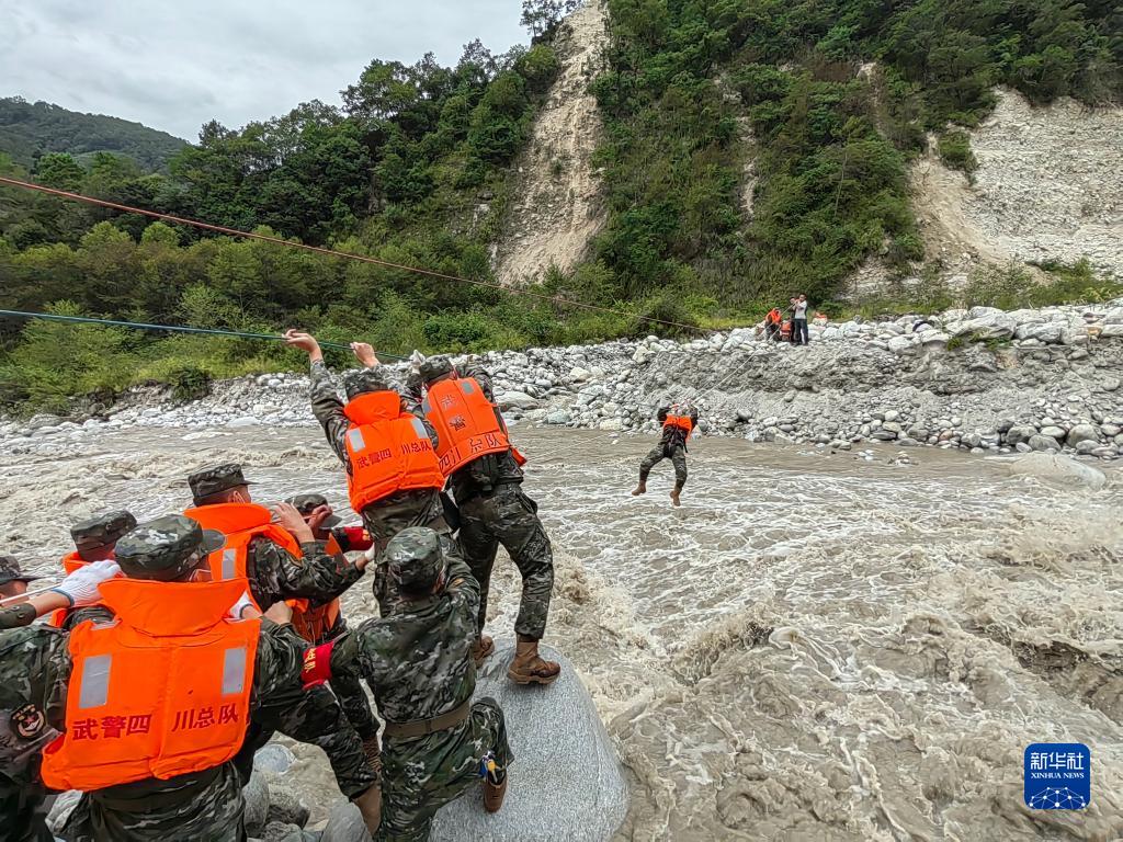 9月6日,武警四川總隊甘孜支隊救援官兵在瀘定縣磨西鎮通過繩索前往河對岸,救助被困群眾。新華社發(張文軒 攝)
