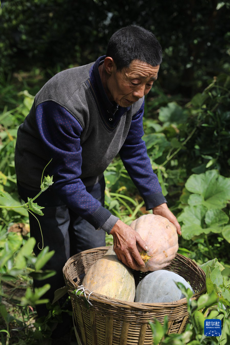9月10日,在四川石棉縣王崗坪彝族藏族鄉挖角村,村民謝欽明在自家菜地里摘南瓜。新華社記者 劉瓊 攝
