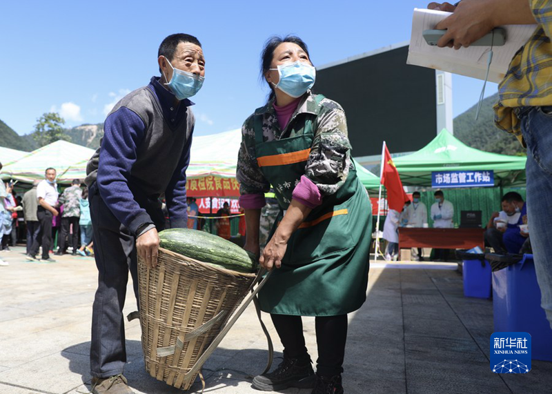 9月10日,在四川省石棉縣王崗坪鄉安置點內,謝欽明(左)為安置點送來南瓜。新華社記者 劉瓊 攝