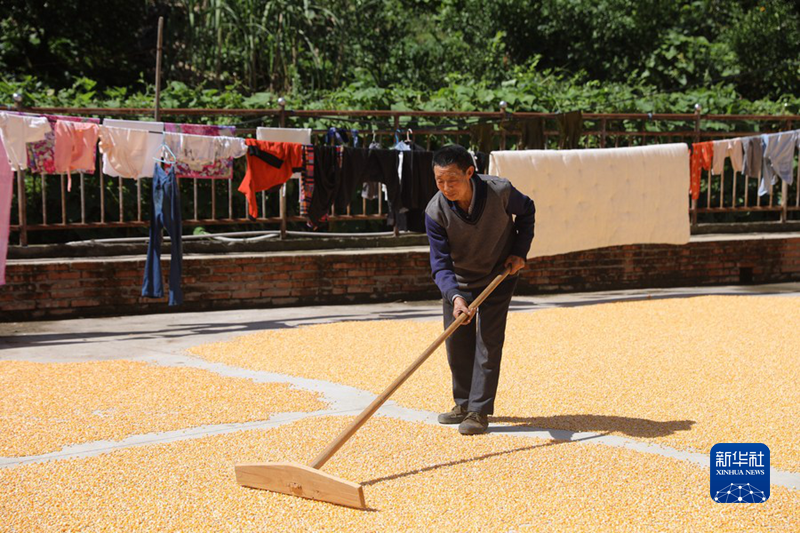 9月10日,在四川石棉縣王崗坪彝族藏族鄉挖角村,村民謝欽明在院子里曬玉米。新華社記者 劉瓊 攝