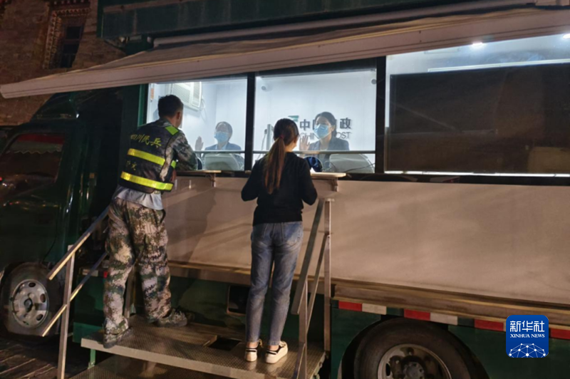 地震后第二天,郵政流動服務(wù)車駛進震中磨西鎮(zhèn)服務(wù)群眾。(四川郵政供圖)
